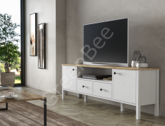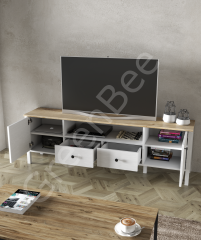 Ortada iki geniş çekmece ve açık raf alanı, yanlarda ise kapaklı dolap bölmeleriyle çok yönlü bir kullanım sunar. Açık ahşap desenli üst tabla ve siyah kulplarla şık bir kontrast oluşturur. Düz beyaz yüzeyiyle sade, zarif ve modern iç mekanlara mükemmel uyum sağlar.